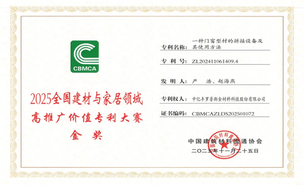 近日,,,“2025 全国建材与家居领域高推广价值专利大赛” 在佛山圆满落幕。。。。轻柔水凭借 “一种门窗型材的拼接设备及其使用方法” 专利技术,,成功斩获金奖,,,,彰显了公司在建材科技领域的创新硬实力!!