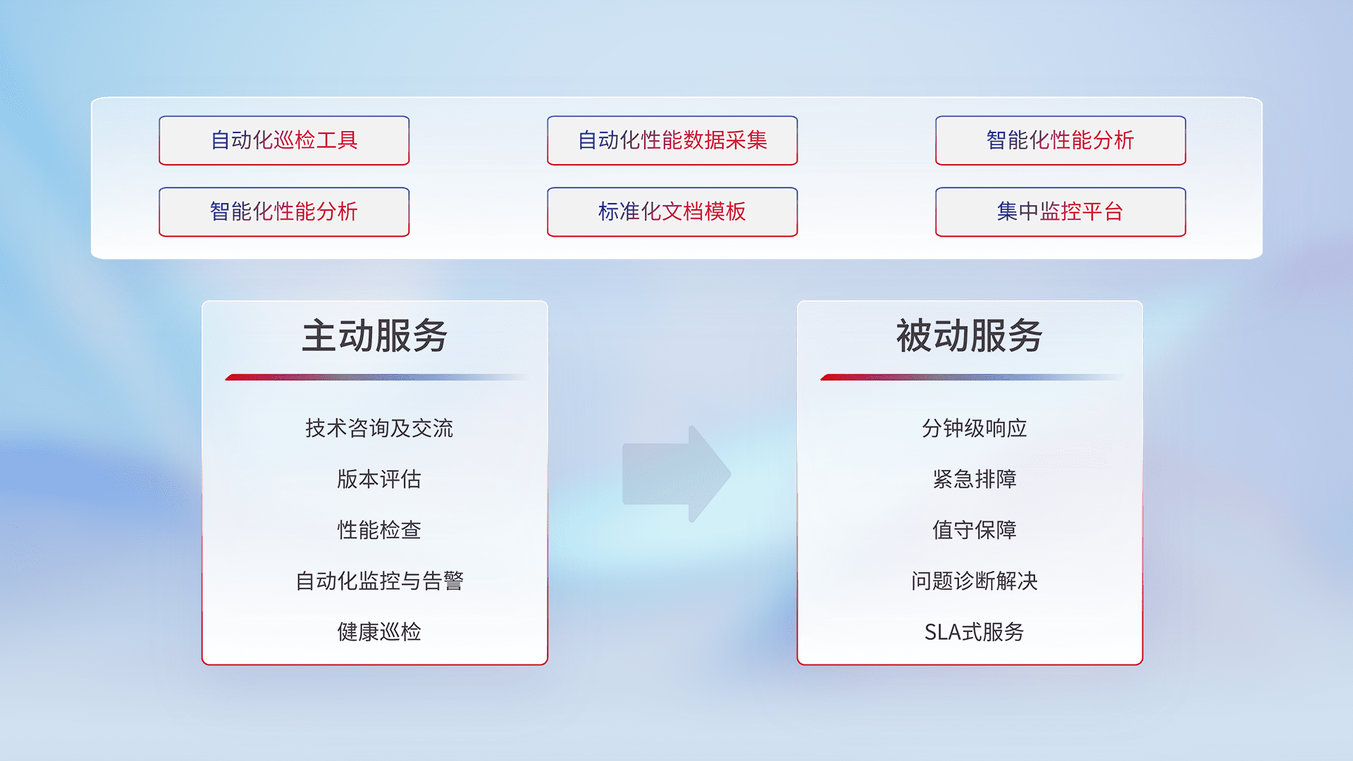 智能化工具和标准化文档,,保障服务质量,,,提供主动服务(包含技术咨询、、、版本评估、、、、性能检查、、、自动化监控与告警、、健康巡检)和被动服务包含(分钟级响应、、、、紧急排障、、、值守保障、、问题诊断解决、、、、SLA服务)。。。